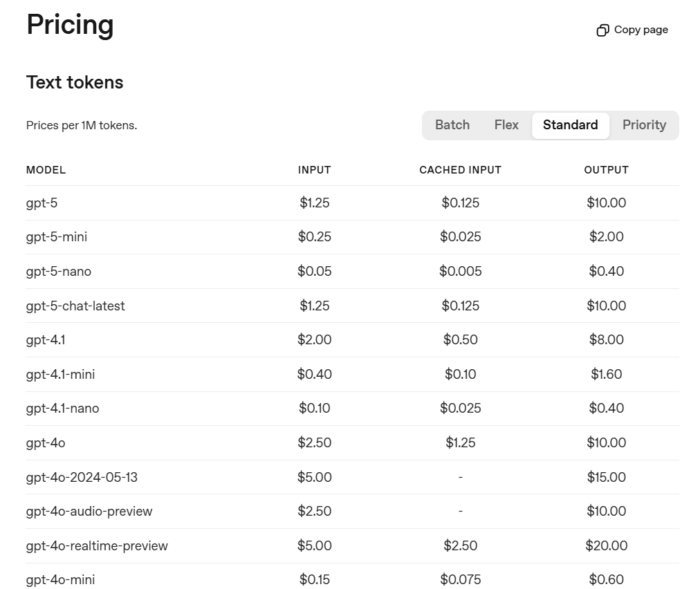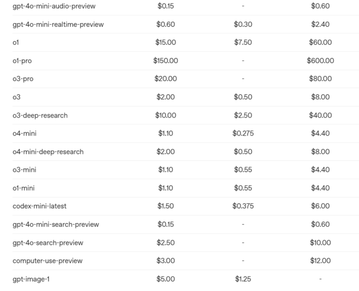以下、ChatGPT APIの最新モデル別料金一覧になります。