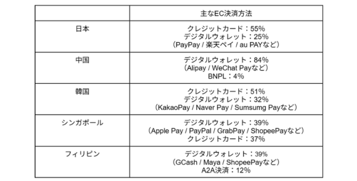 ここでは、日本とアジア4カ国のECにおける主要な決済について解説します。