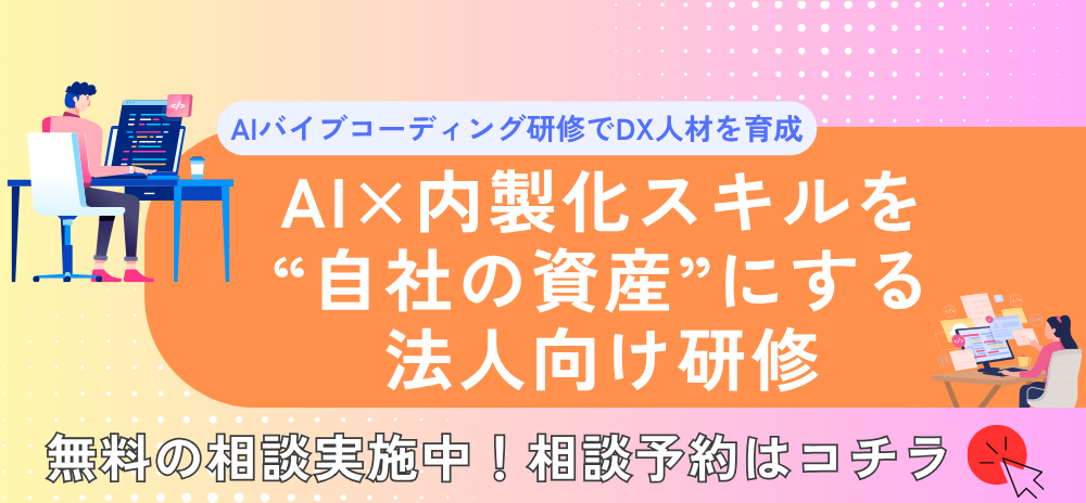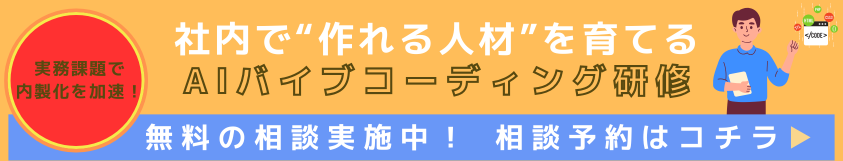 当社では、法人向けにAIバイブコーディング研修プログラムを提供予定です。自社の人材を「自分で業務アプリを開発できる人材」へと育成したいとお考えの場合には、一度ご相談ください。