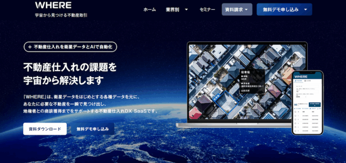 「WHERE」は、不動産販売・開発のためのデータ分析AIプラットフォームです。人口動態・地価・交通・商業施設などの膨大なデータをもとに、出店計画や不動産投資の判断を支援します。