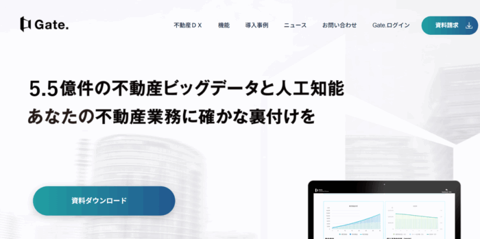 「Gate.」は、独自に収集した数億件規模の不動産データを学習させたAIによる、賃料・利回り・価格などを自動査定するクラウドサービスです。短時間で物件査定を行うことができ、属人的になりがちな査定業務を効率化できるツールとなっています。