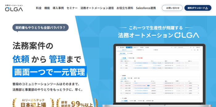 「OLGA」は、契約書レビューや法務チェックを自動化するAIサービスです。契約書をアップロードするだけで、リスク箇所の指摘や条文の改善提案を瞬時に行ってくれるため、不動産取引に関わる契約業務(売買契約書や賃貸借契約のチェックなど)の負担を大幅に軽減します。